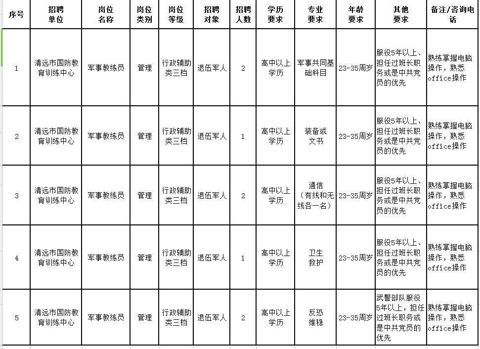 根據(jù)清遠市國防訓練中心工作需要,按照公平、公開、公正、擇優(yōu)的原則,我中心面向社會公開招聘8名工作人員(軍事訓練教官,非政府雇員,非行政事業(yè)編制人員,不列入用人單位編制序列,不擔任行政職務),現(xiàn)將有關(guān)事項公告如下: